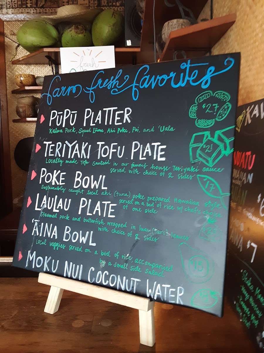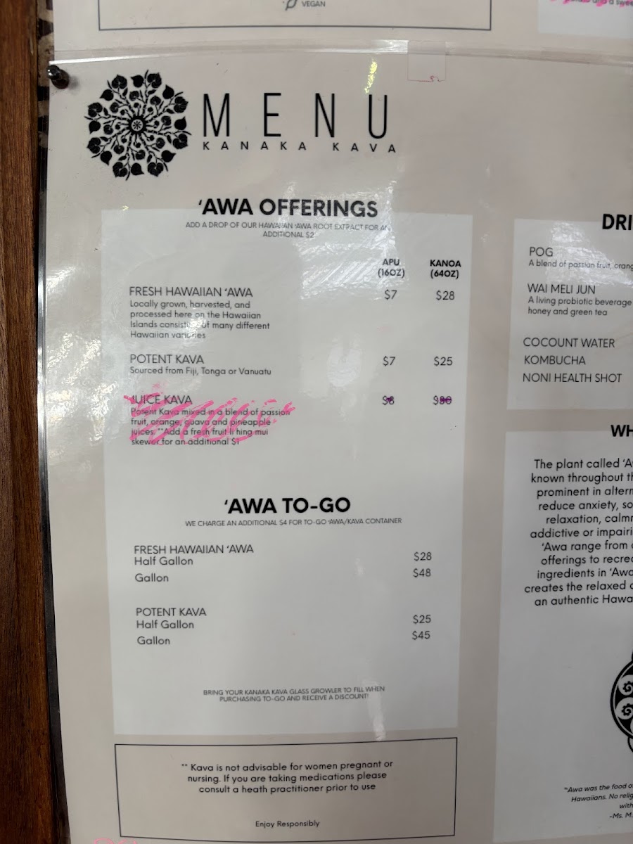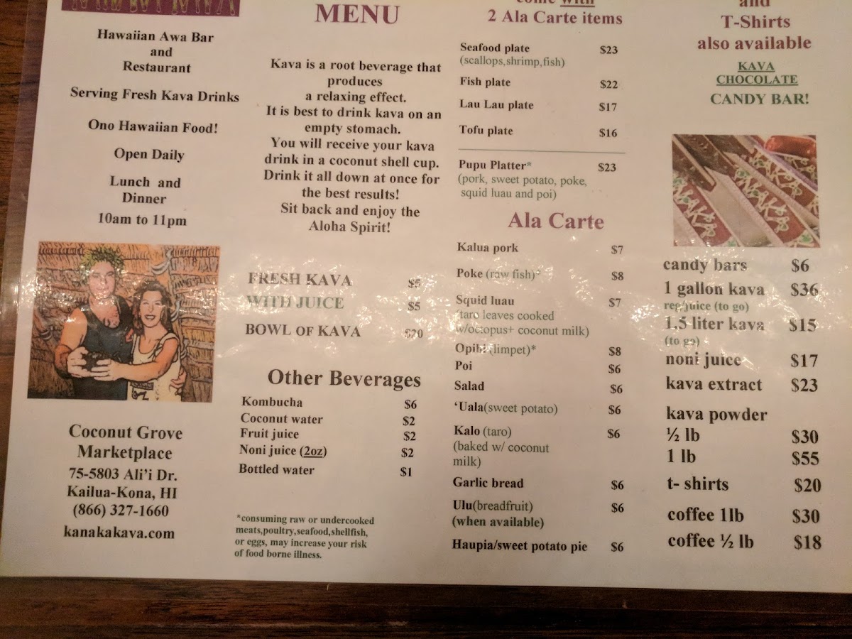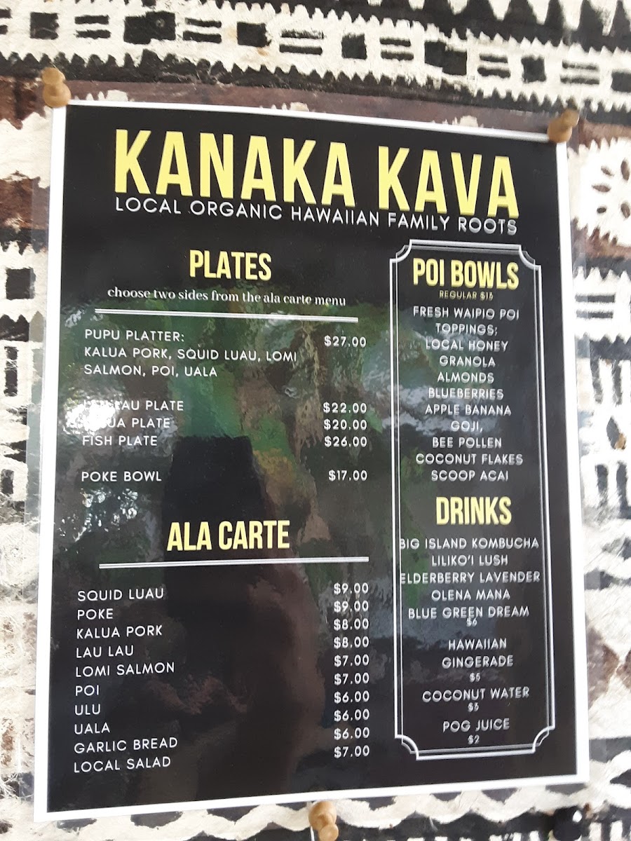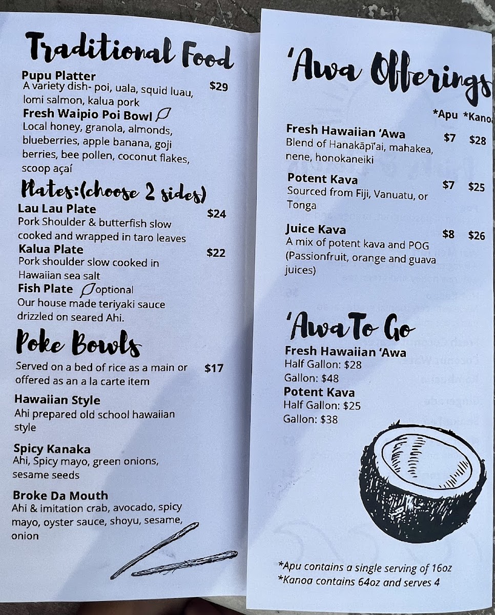 The menu features a range of options ideal for casual meals or light bites throughout the day. Fresh kava drinks take center stage, providing a uniquely Hawaiian experience known for its earthy, soothing character. Alongside these, you’ll find hearty dishes like Kalua Pork plates, Lau Lau, and fresh Poke Bowls, perfect for those seeking a taste of island tradition. Lighter offerings like fresh salads and vegetarian plates also complement the menu’s balance.